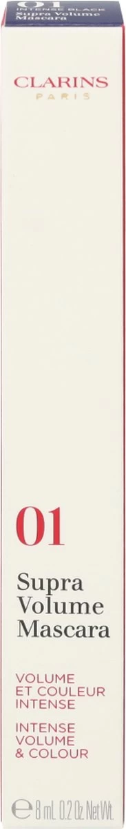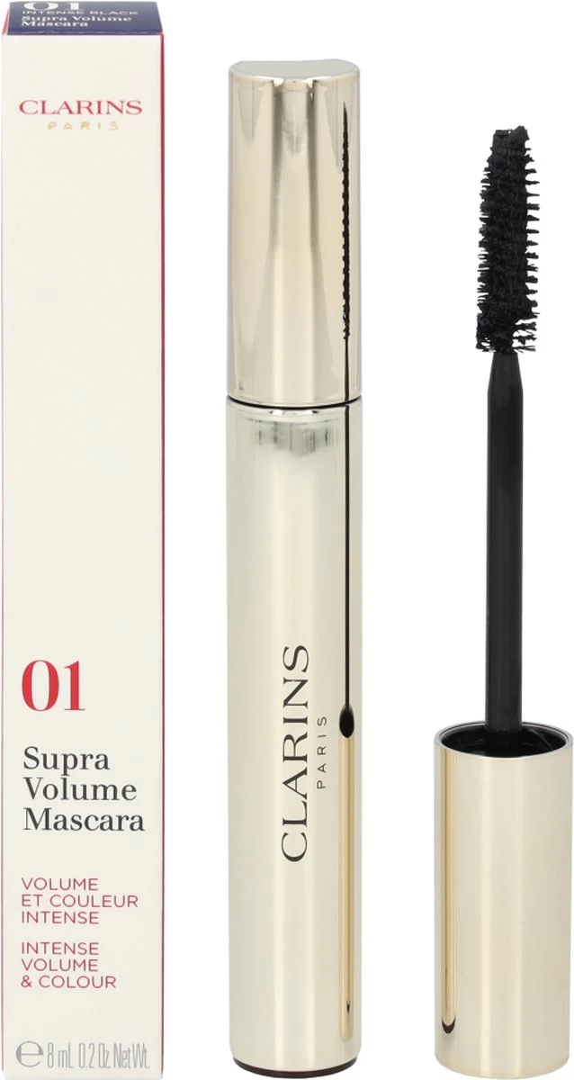 Clarins Supra Volume Mascara heeft een dubbel effect. Enerzijds volume en anderzijds verzorging door de verzorgende make-up formule. Cassia bloem en carnauba was zorgen voor intens volume en panthenol helpt bij het versterken van de wimpers. Voor alle vrouwen die snel een spectaculaire intense blik willen creëren met volumineuze wimpers.