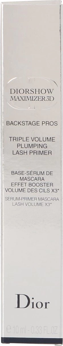 Diorshow Maximizer Wimper primer voor drievoudig volume. De nieuwe zuurstof gemêleerde textuur van Diorshow Maximizer omhult elke wimper met een volle luchtige laag om de effecten van de mascara te intensiveren. Verrijkt met Pure WhiteTM complex, onthult deze primer de optimale kleur en intensiteit van de wimpers. Het revitaliserende olie serum concentraat verbeterd de uitstraling van de wimpers, dikte en krul met een toenemend resultaat, applicatie na applicatie. De exclusieve serum-mascarabasis van Dior backstage geeft de wimpers onmiddellijk extra volume en heeft iedere dag opnieuw een verzorgend effect. Het borsteltje is van soepel elastomeer.