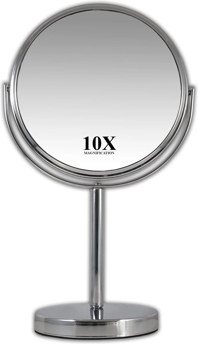 Bent u nog op zoek naar een fijne en betaalbare stand spiegel? Dan hebben wij het product wat u zoekt. Namelijk deze Make-up Spiegel met een doorsnee van 18 centimeter. De Make-up Spiegel beschikt ook over een 10 maal vergrotende kant zodat u alle details extra goed kunt zien. U kunt de Make-up Spiegel helemaal te roteren zodat u makkelijk kunt switchen tussen de normale en vergrotende kant. De Make-up spiegel is gemaakt van hoogwaardige kwaliteit metaal waardoor deze niet snel zal krassen, slijten of roesten, ook de levensduur word hierdoor aanzienlijk verlengd. Het mooie chromen uiterlijk zorgt ervoor dat dit product strak, hip en tijdloos is waardoor deze overal mooi tot zijn recht zal komen. De onderkant is voorzien van schuimrubber wat zorgt voor extra grip en voorkomt krassen op bijvoorbeeld uw badkamer meubel, tafel of kast.