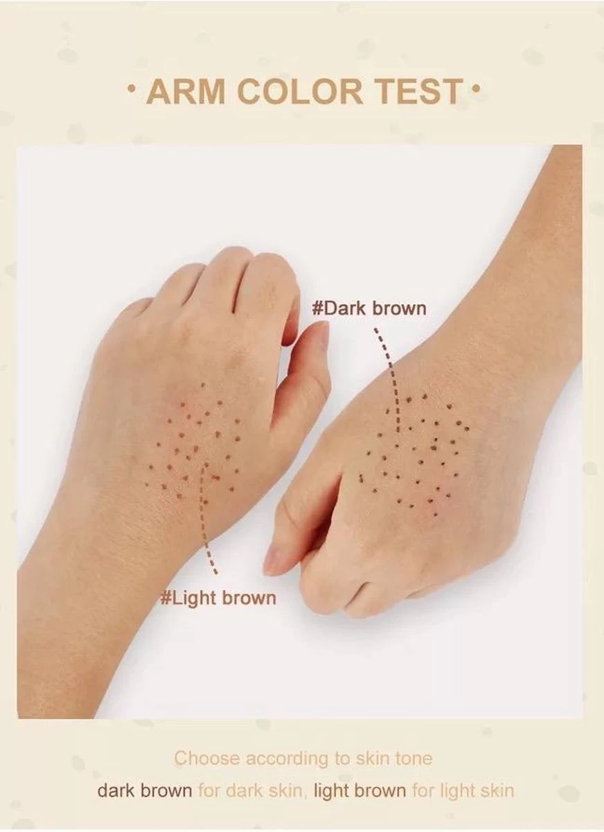 Je kan de sproetjes zo licht/klein en donker/groot maken als je wilt door meer druk uit te oefenen op de pen tijdens het aanbrengen. Ook kan je de sproetjes wat natuurlijker maken door na het aanbrengen er zacht met een vinger overheen te gaan om het sproetje wat meer uit te smeren.