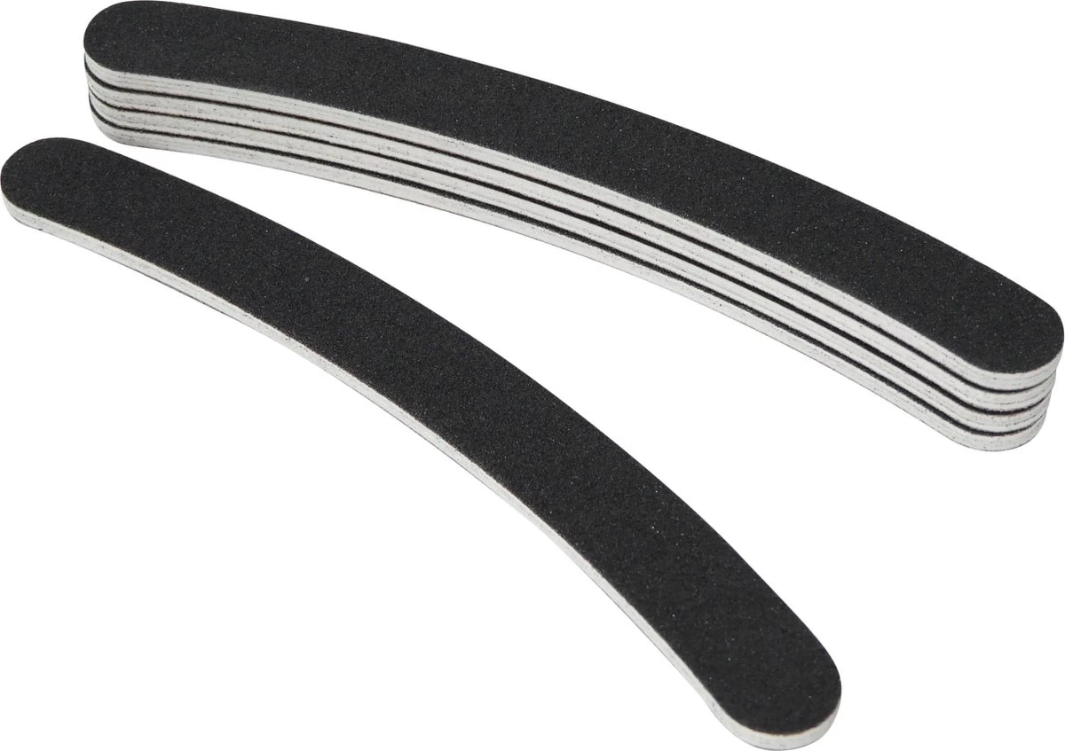 5x boomerang nagelvijlen #100/180, zwart of wit. De korrel #100/180 van de kromme nagevijlen kent een brede toepassing binnen de nagelbranche, zowel voor laatste stap in afwerking van het modellageproduct zoals acryl nagels / gel nagels (kunstnagels) als voor het opruwen van de natuurlijke nagel.