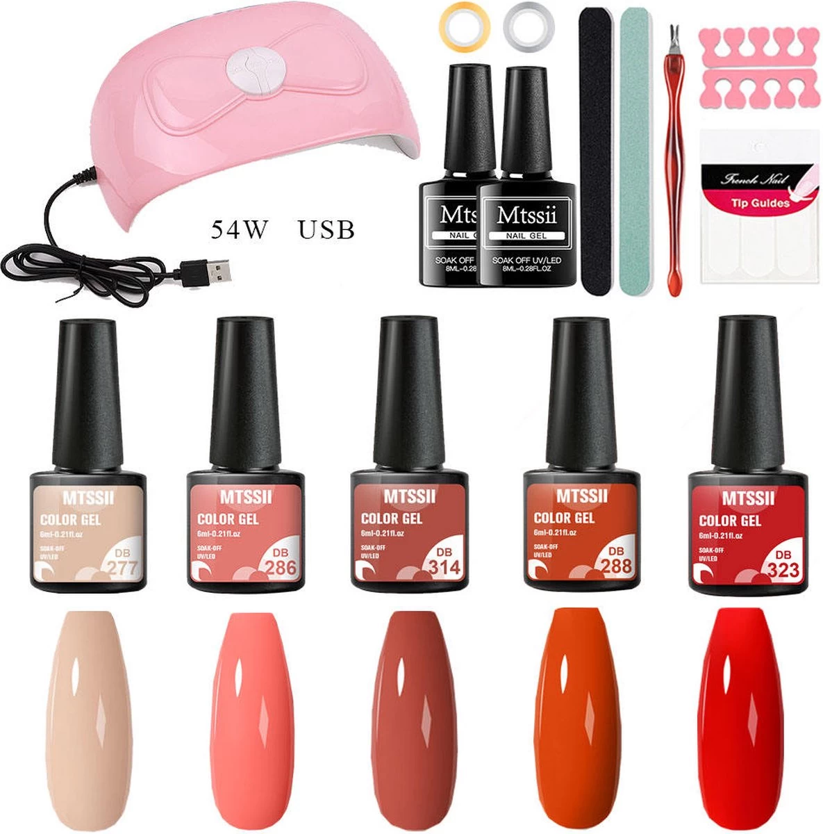 Mtssii – Gelnagel Kit – 5 Kleuren Gellak – Nude En Rood Tinten – Starterkit – Manicure Set – 54 Watt UV Lamp – Gel Nagels Starterspakket – Nepnagels –