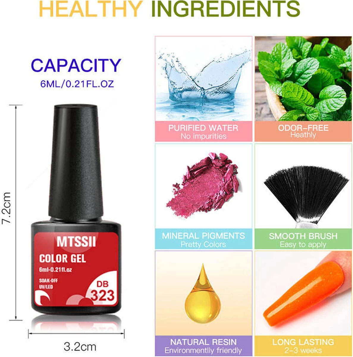 | Ingrediënten | Polygell, Acrylate copolymer, ethyl, mica, iron oxide, ferric ferrocyanides, pigment, microcrystalline wax, polymethyl, methacrylate, polyethylene terephthalate |