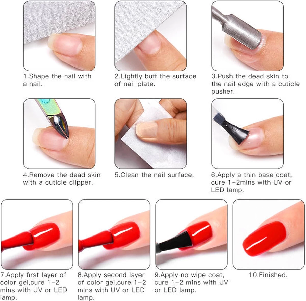 Verkoop door Edward&DeVries. Deze unieke set staat garant voor een perfect resultaat. Met behulp van de bijgevoegde manicure set breng je eerst je nagels in optima forma, waarna je eenvoudig de lak op je nagels aanbrengt. ( een base coat, kleur en topcoat worden dus aangebracht!) Voor een voller resultaat kun je er voor kiezen om nog een volgende laklaag aan te brengen. Natuurlijk laat je ook deze weer onder de bijgeleverde uv-lamp drogen. De base coat en de kleur blijven na droging onder de uv-lamp een klein beetje sticky aanvoelen, dit is normaal. Nadat de topcoat is aangebracht en onder de uv-lamp is uitgehard voelt de nagel droog aan. Neem voldoende tijd om de vloeistoffen te laten drogen voor het mooiste resultaat.