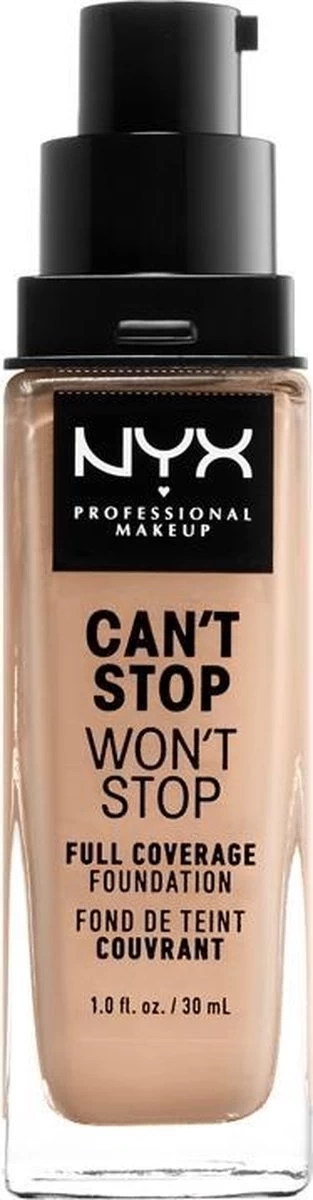 Lichtgewicht, waterproof en super gepigmenteerd. NYX Professional Makeup’s Can’t Stop Won’t Stop Full Coverage Foundation Natural CSWSF07 werkt net zo hard als jij. Deze comfortabele, vloeibare foundation is er in 45 verschillende kleuren en is transferproof. Elke kleur is smooth aan te brengen en laat een matte finish achter die de hele dag blijft zitten. De foundation werkt hard om jouw huid te matteren en om een glimmend gezicht tegen te gaan. Ook verstopt hij de poriën niet en is de foundation te gebruiken voor normale, vette, combinatie en gevoelige huidtypes.