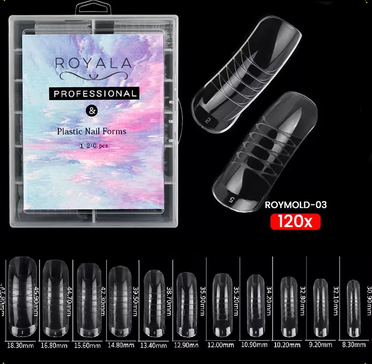 Hou je van acryl of polynagels zetten? Met deze set van 120 dual system forms kun je helemaal los gaan! De dual system forms (ook wel mix system forms genoemd) gebruik je als een mal, waardoor je gemakkelijk acryl of gel (zoals Mixxgel) op je nagels zet. Het resultaat: prachtige lange nagels. Royala heeft 8 types forms dus kies een type form die je wenst. Nagelfanaat, waar wacht je nog op?.