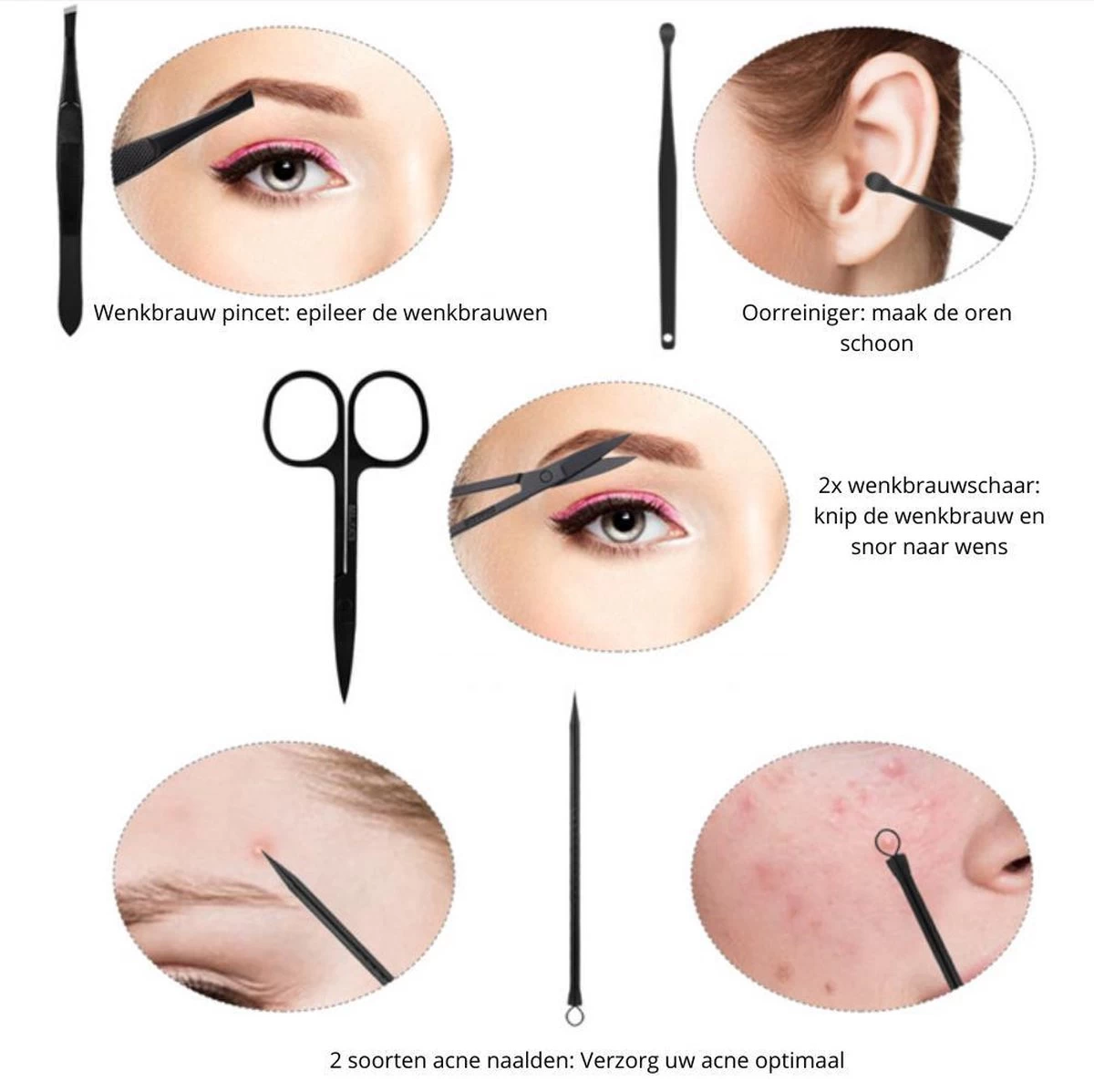 Manicureset: de professionele manicureset bevat onder andere nagel- en teennagelverzorging. Tot de multifunctionele functies behoren handverzorging, gezichtsverzorging, voetverzorging en gereedschapsreinigingsborstel.