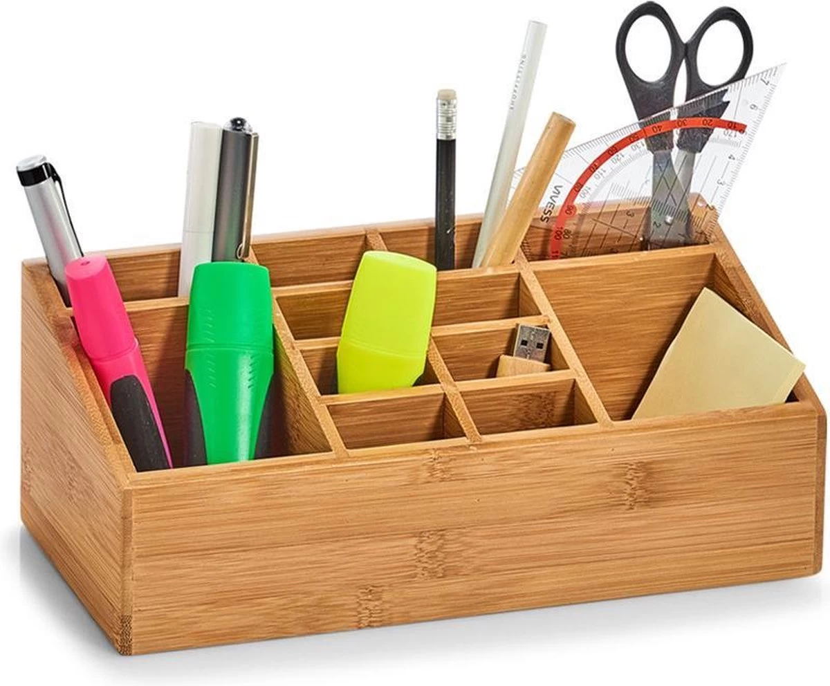 Met deze make-up organizer maak je binnen een paar minuten je badkamer lades weer overzichtelijk. Gebruik de grote vakken om cosmetica producten, zoals crèmepjes, in op te bergen. Of organiseer al je verschillende make-up kwasten bij elkaar. Zo kunnen gezichtskwasten, oogkwasten en lipkwastjes gemakkelijk uit elkaar gehaald worden. In de kleine vakken passen haarclipjes of kleine oogschaduwpotjes. Daarnaast kan deze cosmetica display ook gebruikt worden op kantoor als bureau organizer. Combineer deze opberger met de andere bamboe organizers van Zeller: